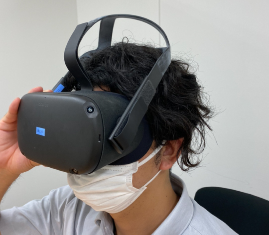 Oculus Quest本体を目の部分に押し付けるようにして当てます。この時、マスクを付けている場合はレンズが曇ってしまうため、鼻の下まで下してください。