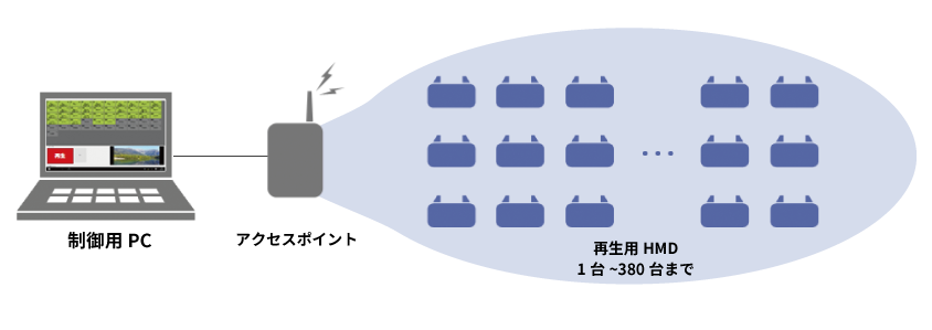 複数の体験者に同時にVR(360度)映像を再生することが可能なシステムです。
